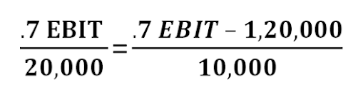 [EBIT × (1- t)] ÷ N1 = [(EBIT- I) × (1-t)] ÷ N2